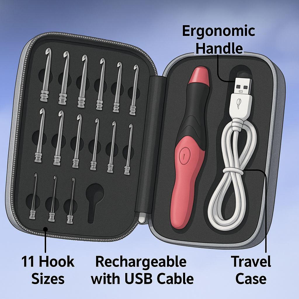 Each hook tip lights up gently, illuminating your yarn so you can crochet with confidence — even on dark colors or during movie nights.