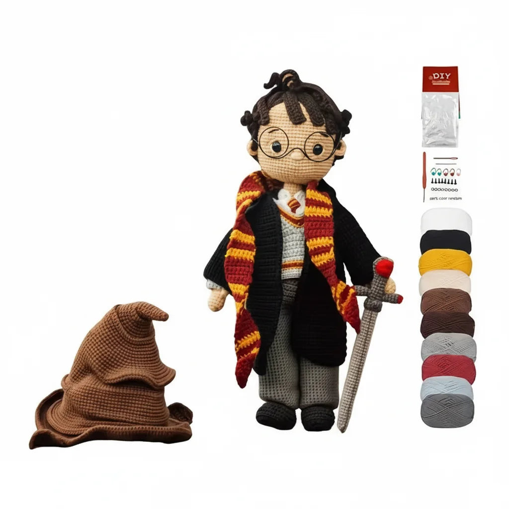 Everything you need for your crafting spell is here! You'll find premium yarn, a comfy hook, and all the enchanted instructions to bring your wizard to life.